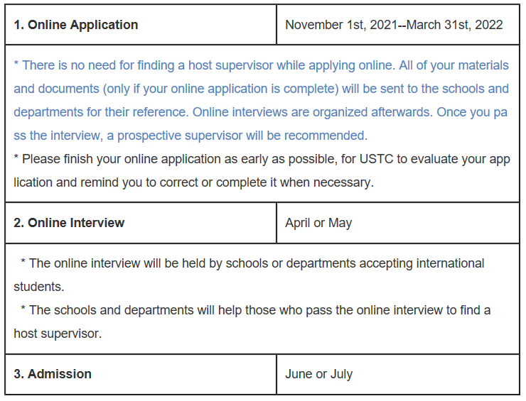 4. Scholarships: Excellent applicants may apply for USTC Fellowship, which covers tuition fee, insurance fee, monthly stipend (up to 7,000 RMB for PhD students and up to 3,000 RMB for master students) and accommodation subsidy. Applicants can apply through the Online Application System. Please refer to the following link for details: USTC Fellowship Program in USTC 2022: http://ic.ustc.edu.cn/en/v7info.php?Nav_x=16