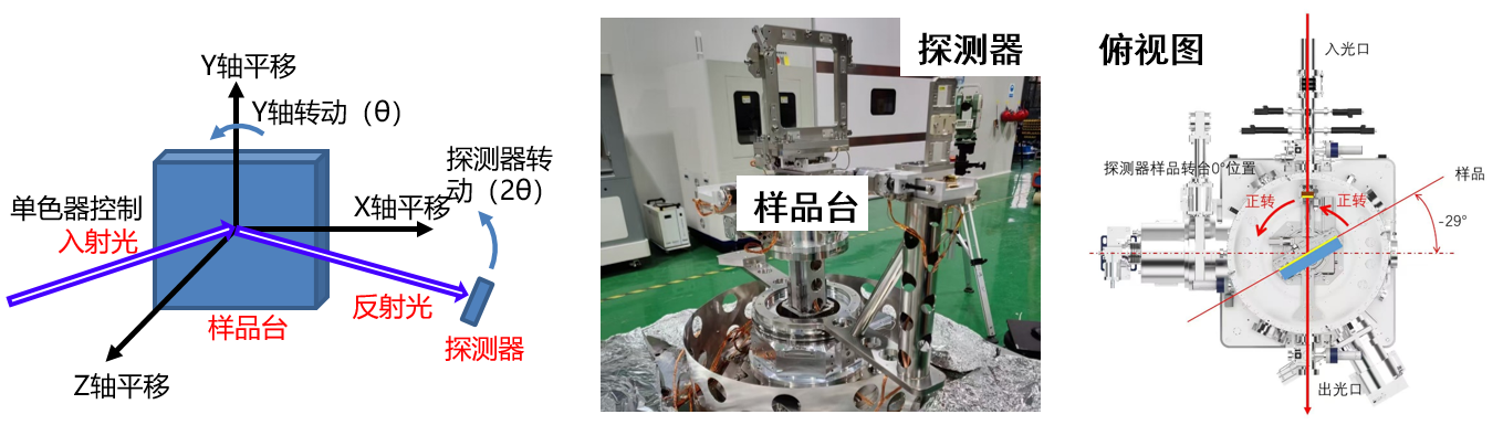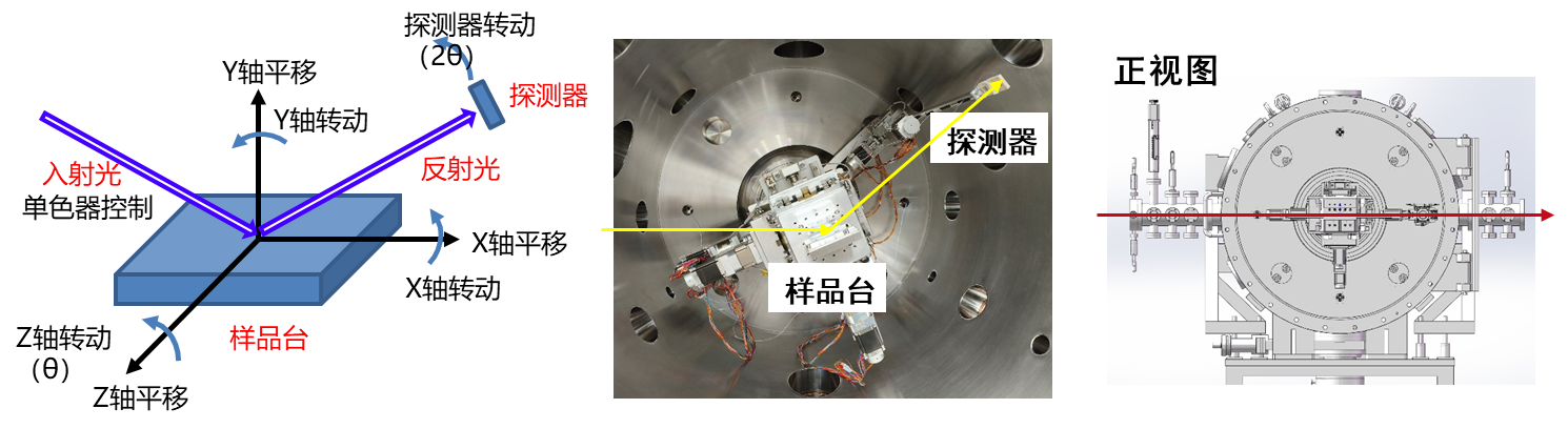 There is a reflectometer for each of the main line and branch line. The core of the reflectometer is two coaxial goniometers, with the sample placed in the center and the detector on the periphery, so as to achieve reflectivity measurement at different incident angles. The detector used is the AXUV100G photodiode. The sample stage has three-dimensional adjustment space, two dimensions for sample switching, and the other dimension can be adjusted according to the sample thickness to make the sample surface coincide with the light path. The reflectometer input light port is equipped with four-blade slits and various filters, which can be used to filter high-order harmonics.