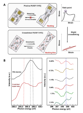 (A) Schematics of the macro and molecular size changes and stress–strain curves of plastic (relative slippage among molecular chains leading to necking and unrecovered, top panel) and elastic (chemical cross-linking blocking the relative slippage among molecular chains and imparting good elastic resilience, bottom panel) deformations of polymer FEs under strain. (B) N K-edge sXAS spectra of PEG-diamine crosslinker and P(VDF-TrFE) with varying cross-linking densities.