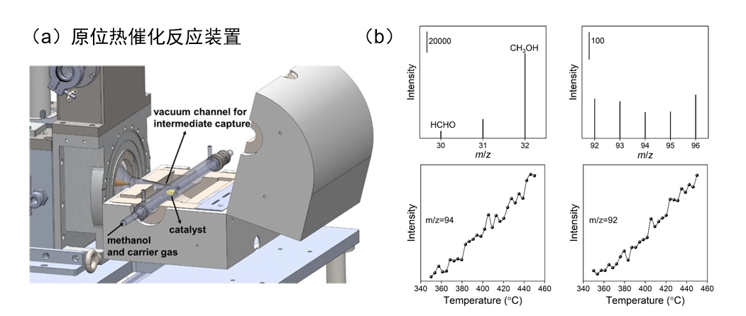 Fig. 1. (a) Schematic diagram of the in-situ thermal catalysis reaction device. (b) Species measured by SVUV-PIMS and their variation trends as a function of reaction temperature.
