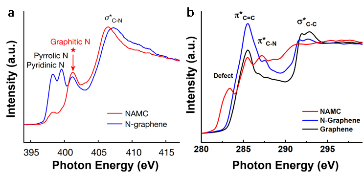 Figure 2. N-K edge absorption spectra (a) and C-K edge absorption spectra (b) of nitrogen doped single atomic layer amorphous carbon