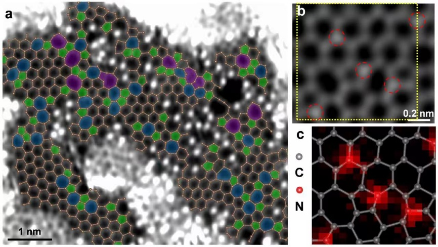 Recently, Professor Lin Guo from Beihang University and collaborators have made a significant breakthrough in the controlled synthesis of two-dimensional amorphous materials. The related research findings were published in the top international journal Nature on September 25, 2024, under the title Nitrogen-doped amorphous monolayer carbon. Amorphous materials possess a long-range disordered atomic structure, endowing them with physical and chemical properties distinctly different from crystalline materials, leading to broad applications in catalysis, optics, electronics, and other fields. However, the analysis of atomic-scale structure and the structure-property relationships in amorphous materials remains one of the most challenging problems in condensed matter physics. Theoretically, single-atom-layer amorphous materials provide an ideal model system for studying amorphous physics. Analyzing their structure and characteristics is crucial for a deeper understanding of the relationships between the structure, degree of disorder, and properties of amorphous substances, thereby advancing the field of condensed matter physics. Nevertheless, challenges such as the precise control of long-range disorder, thermodynamic stability, and the degree of reaction space confinement pose significant obstacles to the controlled synthesis of single-atom-layer amorphous materials. Addressing the long-standing challenges in the synthesis of 2D amorphous materials, the research team proposed a liquid-phase synthesis strategy utilizing nanoscale 2D confinement templates for small molecule polymerization. They successfully synthesized nitrogen-doped amorphous monolayer carbon (NAMC). The team used layered double hydroxide (LDH) nanosheets as templates, whose confinement effect inhibited three-dimensional rotation and entanglement during molecular polymerization. Consequently, polymerization occurred within the 2D plane. This approach broke through the limitation of traditional pyrrole polymerization, which is confined to α-C site crosslinking, and promoted crosslinking polymerization at β-C and N sites. This process ultimately resulted in the formation of a 2D amorphous planar network structure coexisting with five-, six-, and seven-membered rings. The research team precisely mapped the distribution of carbon and nitrogen atoms within the 2D amorphous carbon network, confirming the incorporation of nitrogen atoms into the 2D topological network mixed with five-, six-, and seven-membered rings, achieving a nitrogen doping concentration of up to 9%.