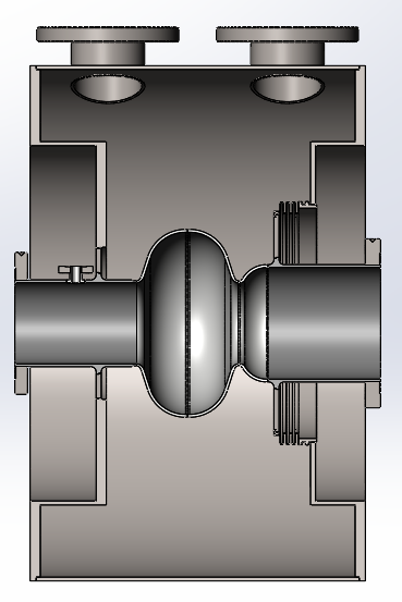 The function of superconducting (SC) 3rd-harmonic cavity is to lengthen bunch and to improve beam lifetime in HALF storage ring. The entire module of SC 3rd-harmonic cavity is listed in Fig. 9. The longitudinal length is calculated to be 1844 mm and the height is 2450 mm. This SC 3rd-harmonic cavity is unique in terms of cavity geometry with two different-radius beam pipes. The fabrication process is much simpler than those of SC harmonic cavities with fluted beam pipes. It should be noted here that the helium vessel is welded to the SC 3rd-harmonic cavity in order to avoid cavity vacuum leak inside the thermal cycles, as shown in Fig. 10. This is quite different from other SC modules in which between the helium vessel and the SC cavity are separated.