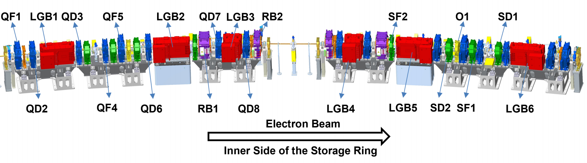 HALF is a fourth-generation, low-energy synchrotron light source operating at a beam energy of 2.2 GeV with an ultralow natural emittance below 85 pm·rad. The facility comprises a full-energy linear accelerator and a soft-X-ray, diffraction-limited storage ring with a circumference of 480 m. In total, 680 main magnets—including longitudinal-gradient dipoles (LGBs), quadrupoles (Q), sextupoles (S), octupoles (O), and reverse bends (RB)—are deployed across the ring’s 20 cells. Fig. 1 shows the layout of a standard cell, in which most multipole families must be adjustable over approximately 80–125% of their nominal strengths (and in some cases beyond), a requirement that can drive elevated pole-tip fields. Despite the associated technical challenges, all magnets have been successfully fabricated.