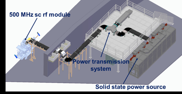 The function of the superconducting (SC) main rf system is to provide cavity voltage for the beam in the storage ring in order to replenish the energy loss caused by radiation. Meanwhile, it provides a good high-order mode(hom) environment to reduce the coupling bunch instability for the beam current. The system mainly includes one set of 500 MHz sc rf module, one set of solid state power source, one set of power transmission system, and one set of digital low-level system (DLLRF) and safety interlock system, etc. The 3D layout diagram of the system is shown in Fig. 8. Some local optimizations have been made to the cavity type and size for the 500 MHz sc rf cavity of the HALF in order to deeply suppress the high-order modes while maintaining a relatively high Q value.