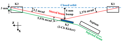A schematic of the local bump injection scheme is shown in Fig. 7. A dual-channel kicker (anti-septum) is installed downstream of the septum. The 2-Ch kicker, in conjunction with conventional Kickers K1 and K3, is designed to induce a local bumped orbit with unequal strengths. Meanwhile, the injected beam passes through the 2-Ch kicker without additional deflection. In this injection scheme, the separation between the injected and stored beams can be minimized, thus reducing the demand on the DA. The NLK is located between K2 and K3. The two off-axis injection schemes are compatible and all the required magnets can be installed in one long straight section.