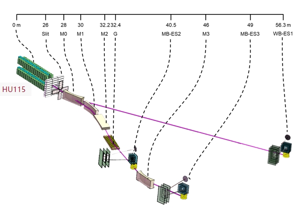 The Energy Conversion and Astrochemistry Photoionization Mass Spectrometry Beamline comprises two branches: a white light branch (WB) and a monochromator branch (MB). The white light branch utilizes an undulator for monochromatization, delivering high-flux white light beams to Experimental Station 1. The monochromator branch employs gratings for monochromatization, providing monochromatic light to Experimental Stations 2 and 3, with two plane variable-line-spacing gratings installed to accommodate different experimental requirements. The two branches are switched via the deflection mirror M0 and operate on a time-sharing basis. A Monk-Gillieson (MG) monochromator design is adopted. M2 serves as the pre-focusing mirror of the monochromator, and G is the plane variable-line-spacing grating. Together, they form the MG monochromator. During wavelength scanning, only the rotation of the grating axis is required, resulting in a simple structure. This system features a straightforward design and, when coupled with an Undulator light source, directly uses the source as the entrance slit, facilitating high throughput.