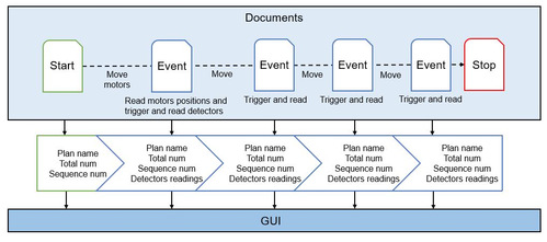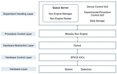 The hardware layer comprises motors, detectors, and other related physical components. The hardware control layer employs a distributed architecture based on EPICS. These IOCs collectively provide the Process Variables (PVs) essential for the hardware abstraction layer. The hardware abstraction layer uses Ophyd from the Bluesky project to convert PVs into Python objects. The procedure control layer executes Bluesky Plans, such as step scans, fly scan, and associates various metadata with experimental raw data. It provides an interface to the experiment handling layer in the form of scripts. The experiment handling layer is primarily used for organizing and managing Plans. Additionally, it is responsible for collecting and processing the data generated during experiments.