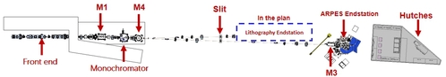 The beamline is sourced by an elliptically polarizing undulator (EPU120). A cylindrical mirror M1 collects the diverging beam from the undulator and horizontal focus the beam to the exist slit-H. The monochromator is Plane Grating Monochromator type, consisting a plane mirror M2 and two different variable line spacing (VLS) gratings. The monochromator energy-disperses VUV-light, which is then focused vertically to the exist slit-V by the VLS gratings. Monochromatized X-ray beam is switchable into two branches by the plane mirror M5. At Branch A, VUV-beam light is refocused by a KB mirror set to a sub-micro size.