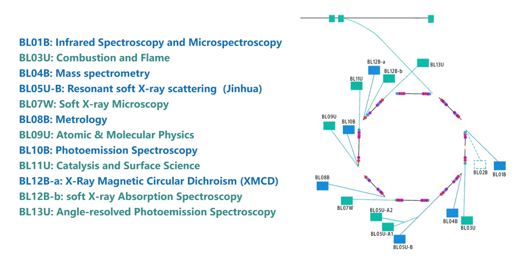 Additionally, there are 5 bending magnet beamlines, which include Infrared Spectroscopy and Microscopic Imaging, Mass Spectrometry, Metrology, Photoelectron Spectroscopy, Soft X-ray Magnetic Circular Dichroism, and Soft X-ray In-situ Spectroscopy beamlines and stations.