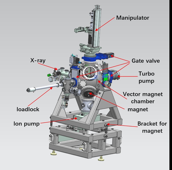 Branch B is a vector magnet endstation, equipped with a vectorial magnetic field up to 0.9 T, a loadlock, a X-ray ferromagnetic resonance (XFMR) manipulator and XAS/XMCD/XMLD manipulator. This vector magnet endstation is designed to measure small-size spintronic device with probing spot size of 3μm ×3μm, ultrafast GHz magnetic dynamic process and spin current/orbital current transmission.