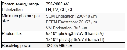 The beamline is sourced by twin elliptically polarizing undulators (EPU43.5). The twin EPUs can operates in parallel and collinear modes. A plane mirror M1 deflects the beam by 2° to reduce the heat load and cut off the high energy X-rays. The monochromator is a variable-line-spacing plane grating monochromator type, consisting a plane mirror and two different gratings. Monochromatized X-ray beam is switchable into two branches by the ellipsoidal cylindrical mirror M3. The parallel beams is reflected to the exist slit by M3. Then they are reflected by M6 and further focused by KB mirror set (M7&8) to the Superconducting Magnet (SCM) Endstation and Cryo-PEEM Endstation. A chopper is place behind the exist slit to make the parallel beams alternately illuminating the SCM Endstation. The beam sizes at the SCM Endstation and PEEM Endstation are 200×40 m and 26×53 m. When M3 removed from optical path, the collinear beams are reflected and focused by KB mirror set (M4&5) to the Vector Magnet (VM) Endstation. The beam sizes at the VM Endstation is 3×3 m.