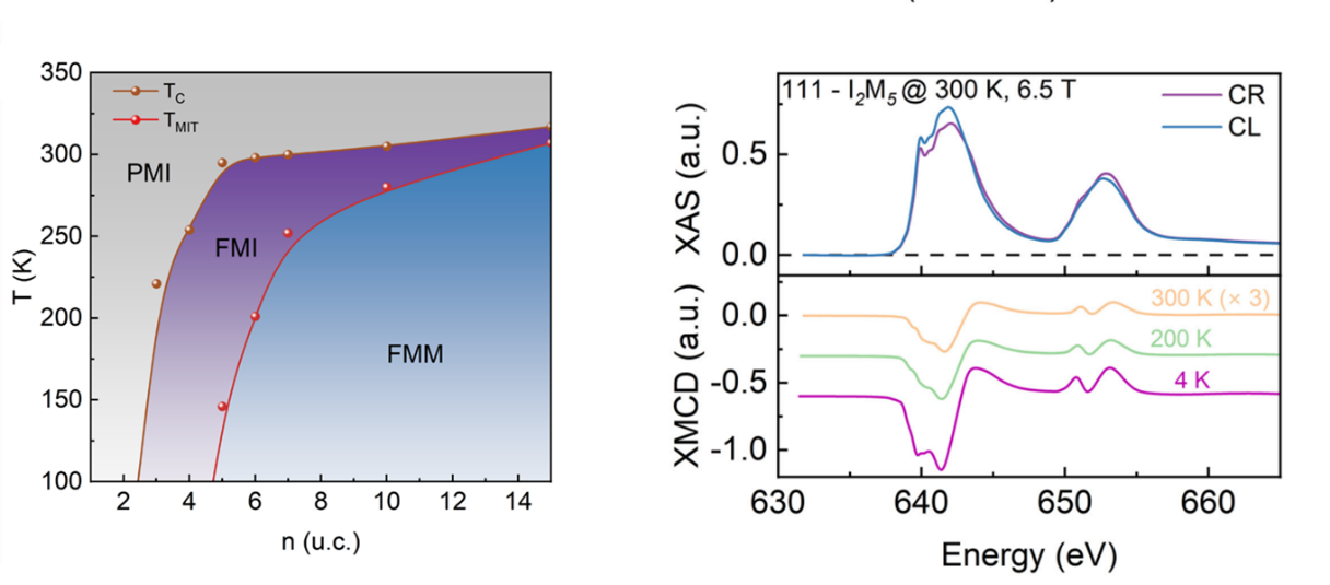 Using their self-built pulsed laser deposition system, the team grew SIO/LSMO superlattices with sharp atomic-level interfaces. Magnetotransport measurements showed stable ferromagnetic insulating behavior near 300 K, and X-ray magnetic circular dichroism (XMCD) further verified room-temperature ferromagnetism originates from LSMO’s double exchange interaction. DFT first-principles calculations revealed significantly suppressed charge transfer at (111)-oriented interfaces, indicating insulation isn’t from direct electron exchange between SIO and LSMO. Integrating experiments and theory, they proposed: At (111) interfaces, strong SOC couples with polarons in LSMO, enhancing electron-phonon interactions, reducing carrier mean free path, and inducing insulation. This mechanism offers a new physical picture and theoretical framework for understanding ferromagnetic insulator (FMI) formation and room-temperature stability.